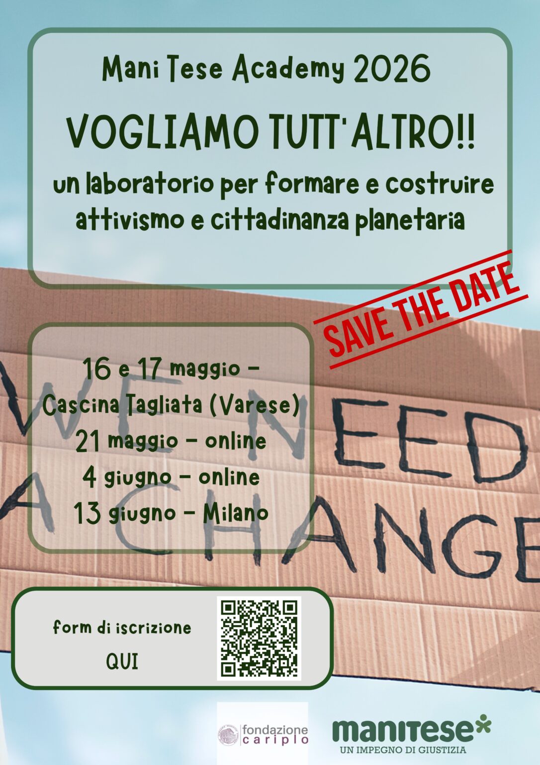 Mani Tese Academy 2026 si inserisce all’interno del progetto “Be The Change – Orizzonti per una crescita sostenibile”, cofinanziato attraverso il Bando Riprogettiamo il Futuro promosso da Fondazione Cariplo.