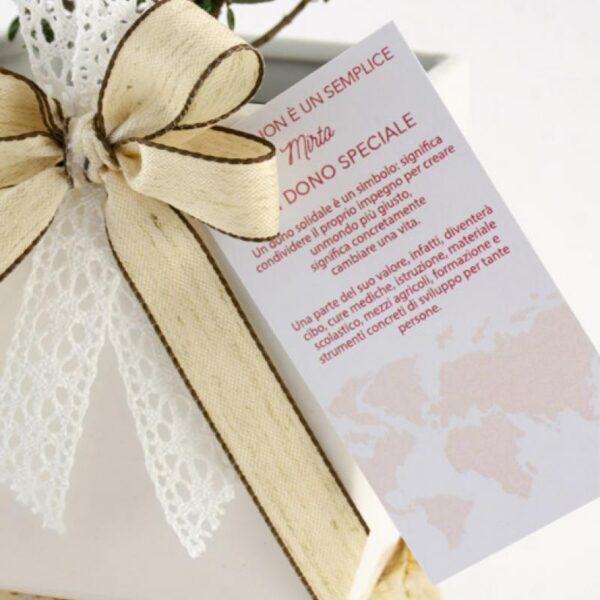 La bomboniera per il tuo matrimonio o un dono speciale per un battesimo, una comunione, una cresima e una laurea. Immagina il tuo dono, un giorno rigoglioso e fiorente: il caloroso ricordo di un giorno speciale e dell’impegno concreto per le comunità più vulnerabili a cui, proprio come una pianta, hai donato la possibilità di crescere!