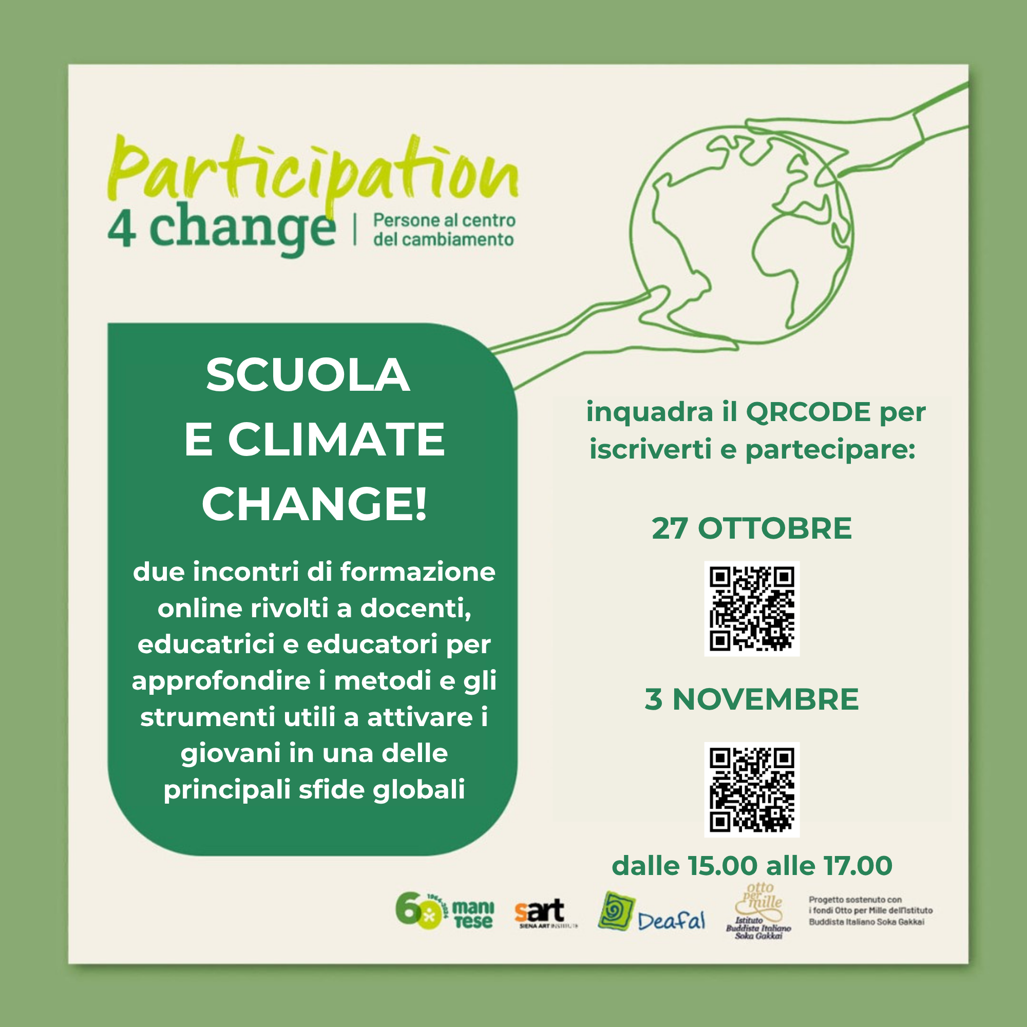 Il 27 ottobre e il 3 novembre 2025, nell’ambito del progetto “Participation 4 Change: persone al centro del cambiamento”, si terranno due incontri di formazione on line, rivolti a docenti, educatrici ed educatori per approfondire metodi e strumenti utili ad attivare i giovani in una delle principali sfide globali del nostro tempo: il contrasto al cambiamento climatico globale.